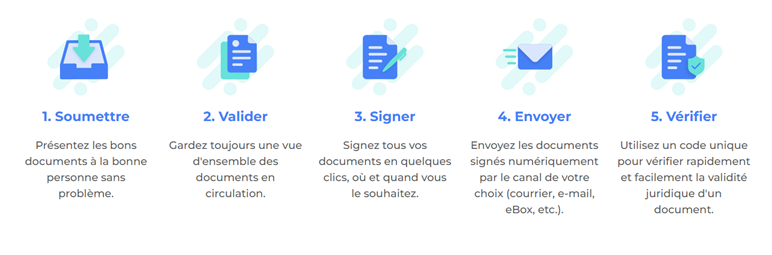 eSignFlow permet de présenter les bons documents à la bonne personne, de garder une vue d'ensemble sur les documents en circulation, de signer en quelques clics depuis n'importe où, et d'envoyer les documents signés par le canal de votre choix : courrier, e-mail, eBox, etc.
